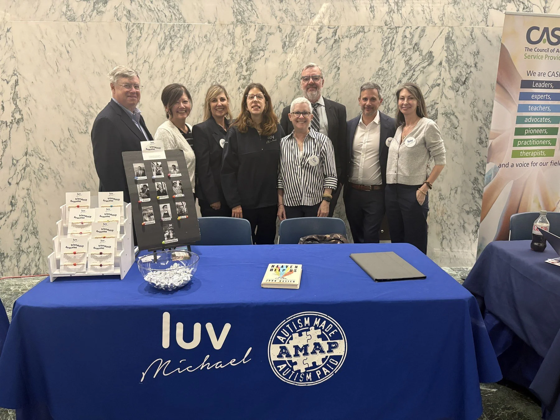 Autism Action Day, Albany, April 2026. Left to right: Will Powers, Jeanette Powers, Dr. Lisa Liberatore, Jenna Carballo, Jeff Damon, Heather Damon, Mark Biondi, and Kim Biondi at the Luv Michael table in the Capitol rotunda.