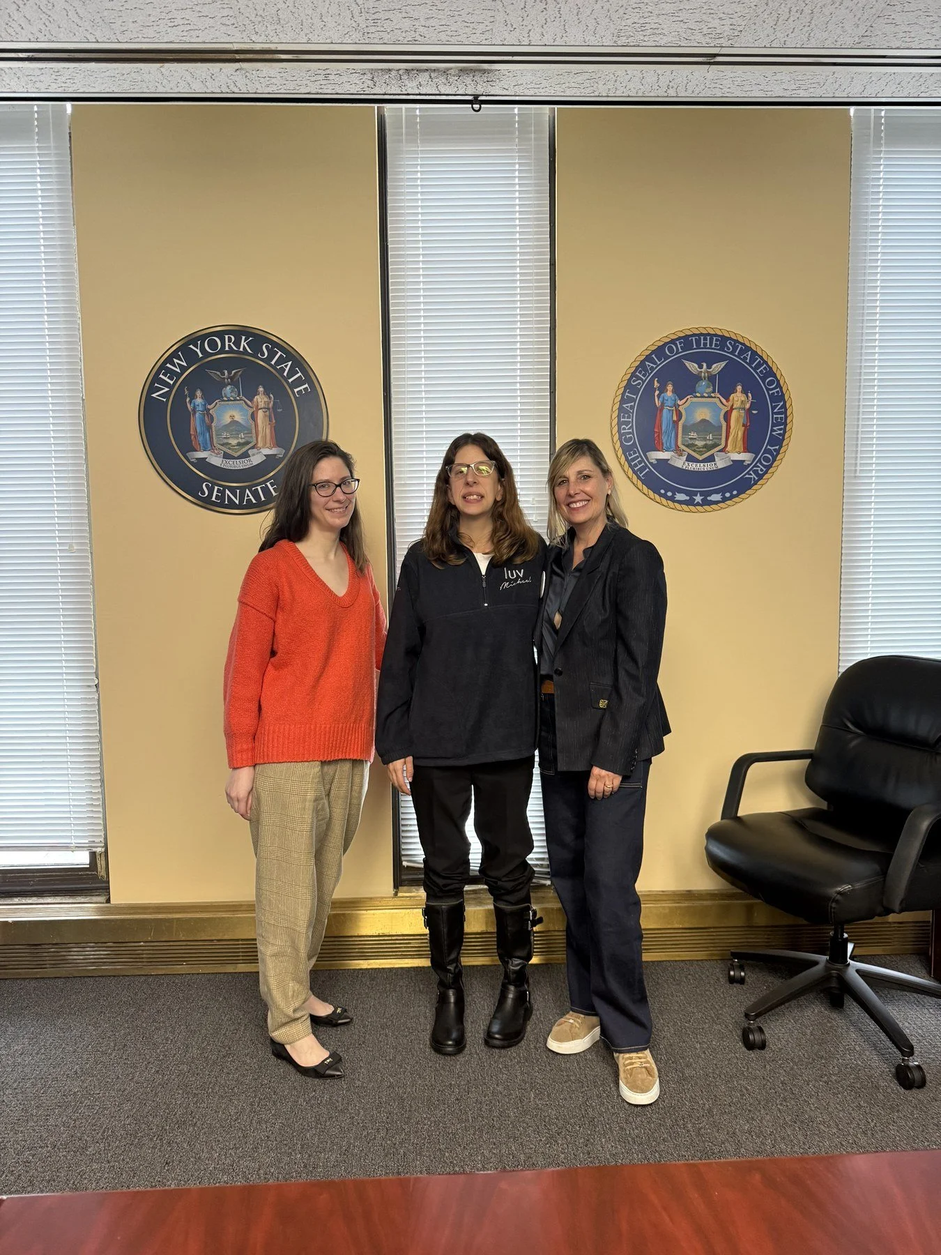 Left to right: Anna Sargeant, Jenna Carballo, and Dr. Lisa Liberatore in a New York State Senate office.