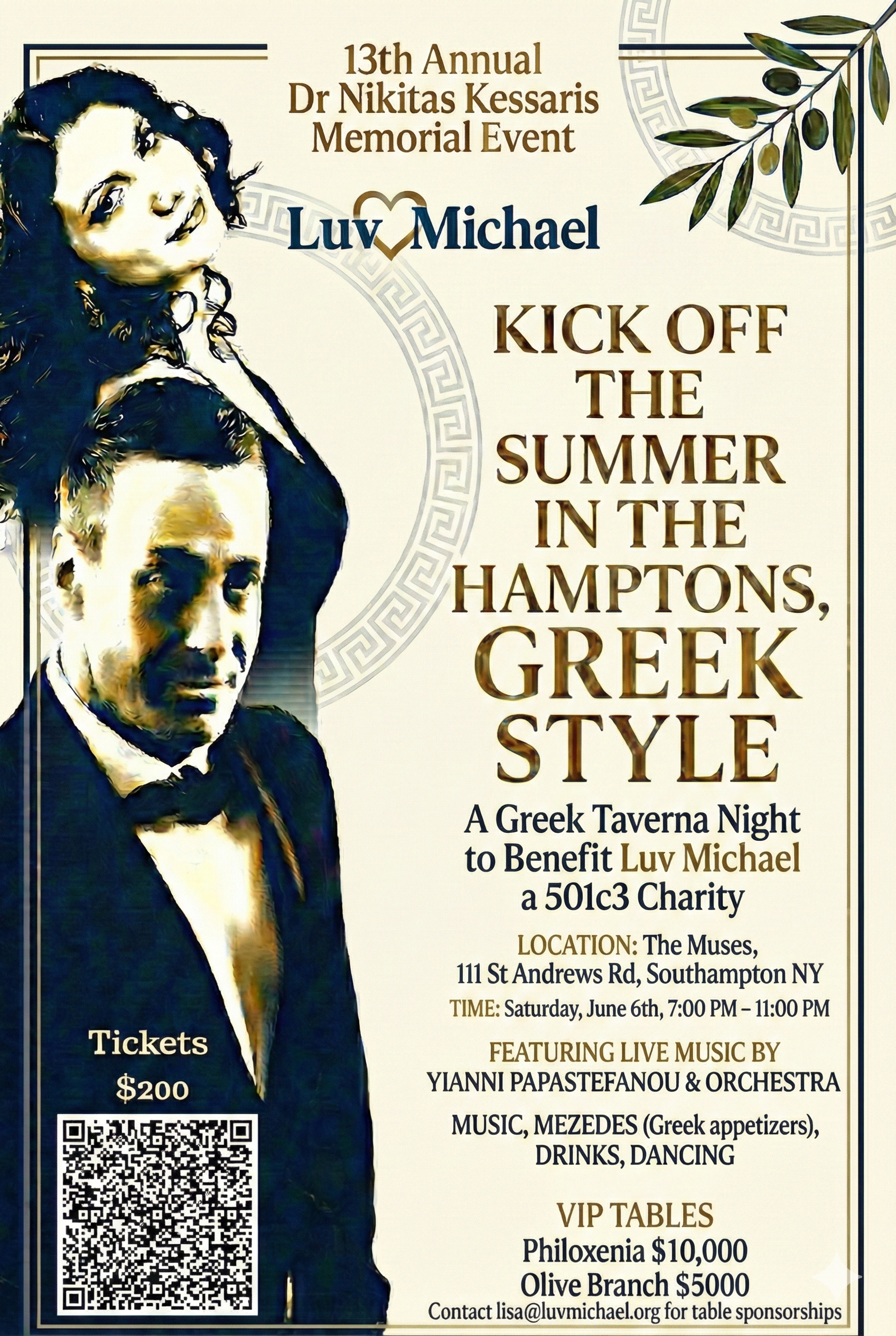 On Saturday, June 6th from 7:00 PM to 11:00 PM, Luv Michael invites you to The Muses at 111 St. Andrews Road in Southampton, NY for the 13th Annual Dr. Nikitas Kessaris Memorial Event, a vibrant Greek Taverna Night celebrating community, culture, and a cause that changes lives.